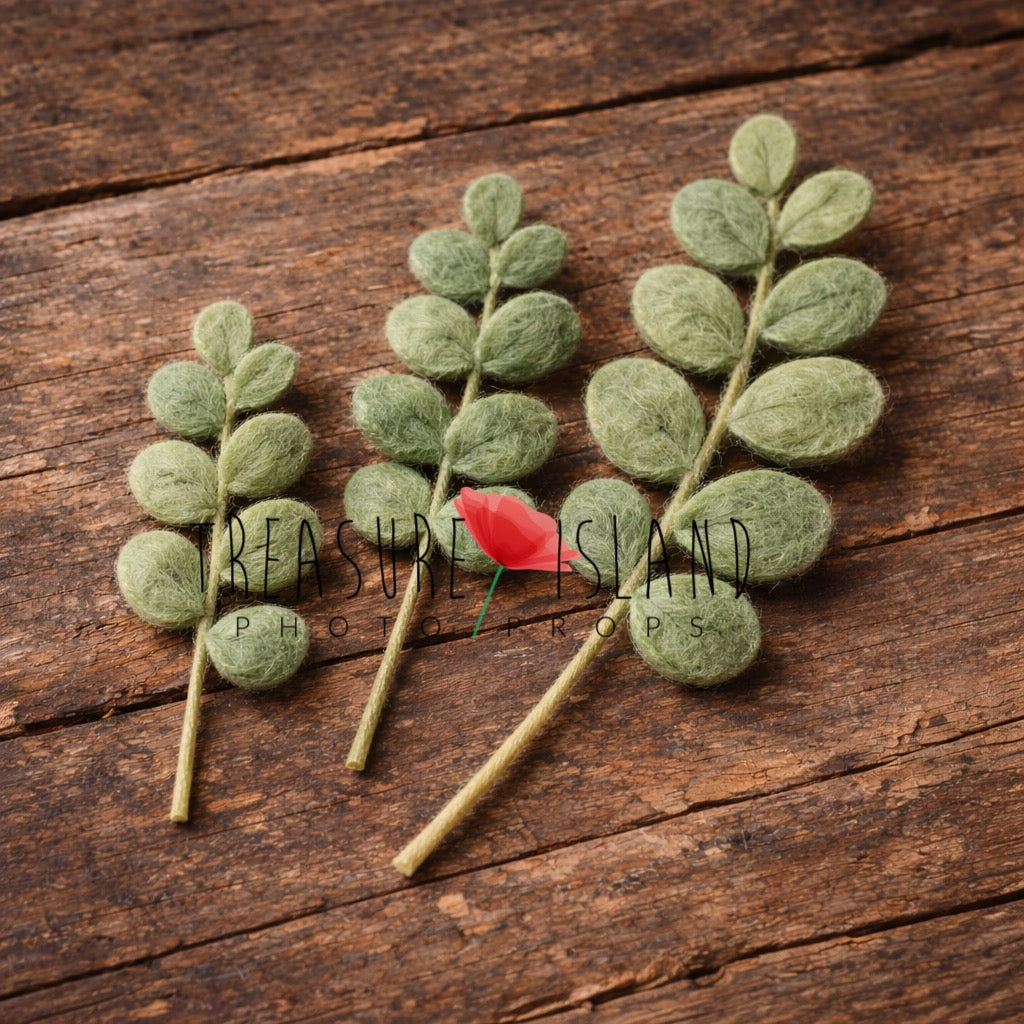 ニューボーン撮影に自然でやさしい森の雰囲気を添える、ハンドフェルトのユーカリ枝3本セットです。上質な天然メリノウールを使用し、1枚1枚丁寧にニードルフェルトで仕上げています。